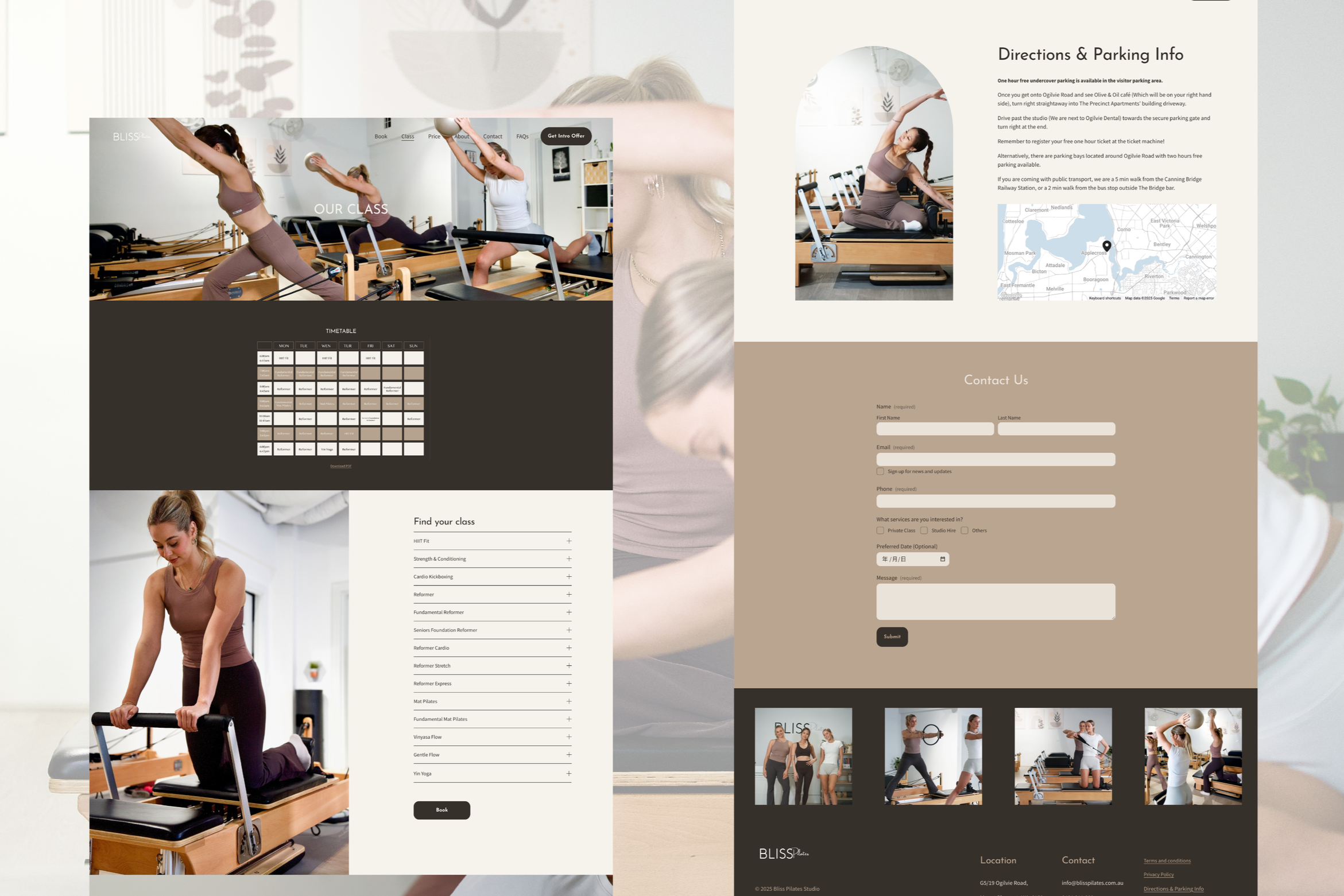 We created a brand new website for Bliss Pilates, redefining its brand colors with a natural earth-toned coffee palette to convey a sense of maturity, stability, and safety. Helping to create a space where people feel calm and comfortable.